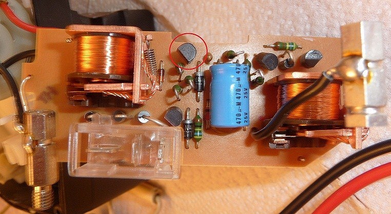 In diesem Fall ist entweder eins der Relais verklebt und kann nicht mehr zurückfallen oder aber einer der beiden Schalttransistoren ist defekt. Auf dem Bild sieht man den eingekreisten Transistor, der verhinderte, dass die Antenne unten abschaltet.