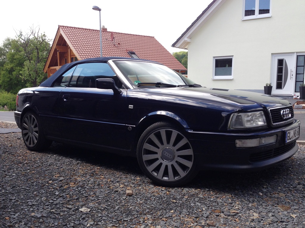 Beschreibung: Audi Cabrio Bj. 8/97, ADR, 92 kw, Klima, Leder: Grau, E-Verdeck Blau, MAM 8 8x18 mit 225/40, Wurzelholz, Sportlenkrad, Sitzheizung;